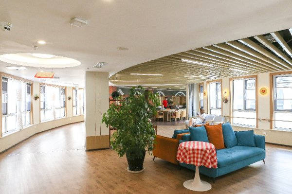 ,项目由清华大学建筑学院周燕珉教授亲自设计,全程围绕认知障碍老人的行为习惯和心理需求,打造科学、舒适、安全的居住环境,从根源上缓解认知障碍老人的焦虑、不安等情绪。采用“小组团大家庭”的照护模式,将院区分为多个小组团,每个组团内的老人彼此熟悉、相互陪伴,感受家庭式生活氛围,同时便于工作人员高效、高质量照护,避免认知障碍老人因陌生环境产生恐惧心理。室内采用环形设计空间,有效缓解认知症长者因定向障碍造成的焦虑不安、游走、幻觉等症状;室外打造五感花园,为训练老人多感官刺激而设计,通过视觉、听觉、嗅觉、触觉、味觉的多维度刺激,缓解认知衰退,提升老人生活质量。